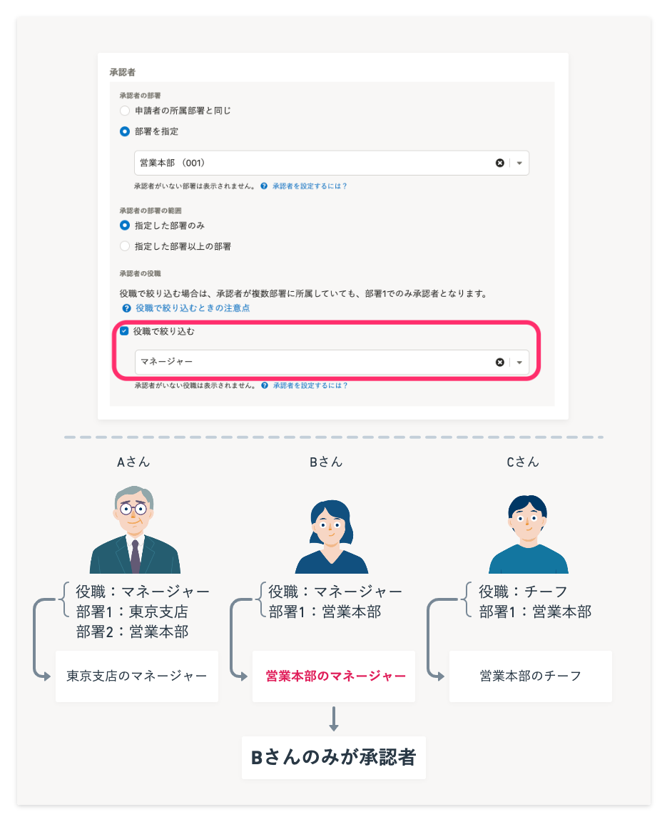 代替テキスト:経路の設定画面で承認者を部署と役職で指定した画面のスクリーンショット。その下には3人の登場人物を例に、本文の内容を説明するイラストがある。