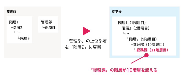 「管理部」の履歴を更新し、「階層9」を上位部署に設定した場合、「管理部」の下位部署である「総務課」の履歴も更新されます。