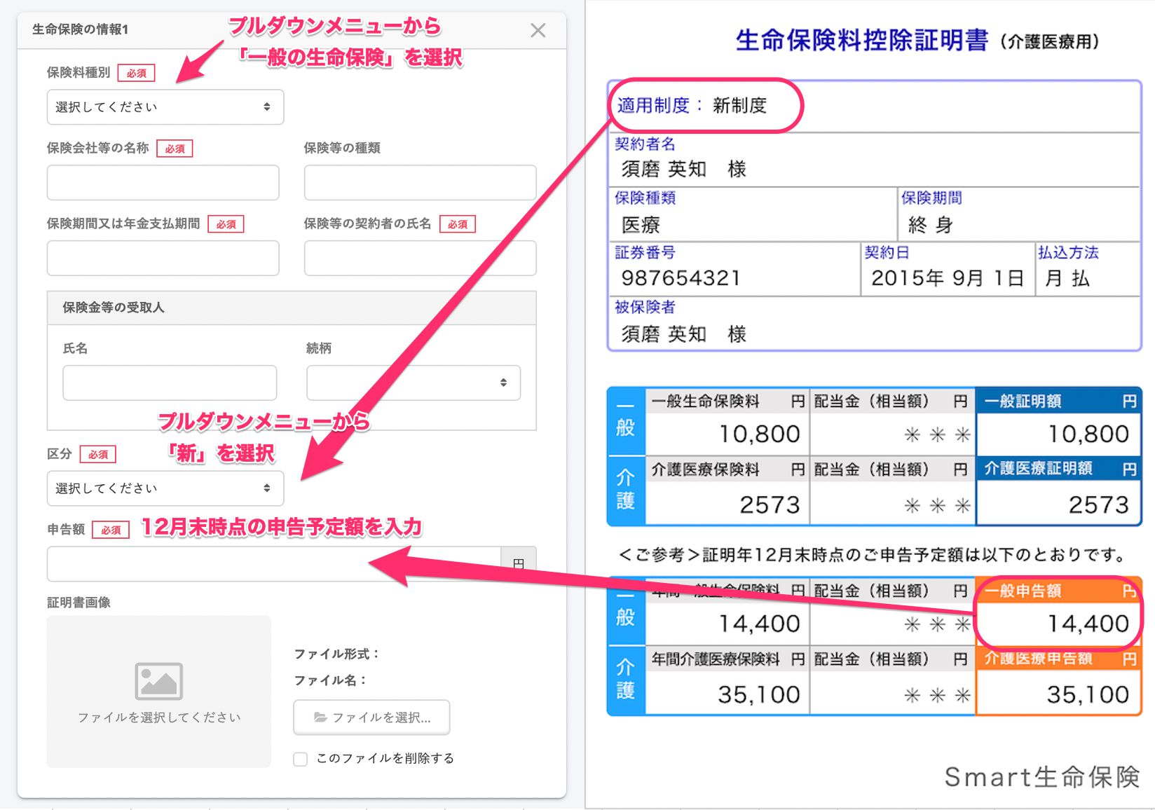 代替テキスト:SmartHRの画面と保険料控除証明書の対応を表す図