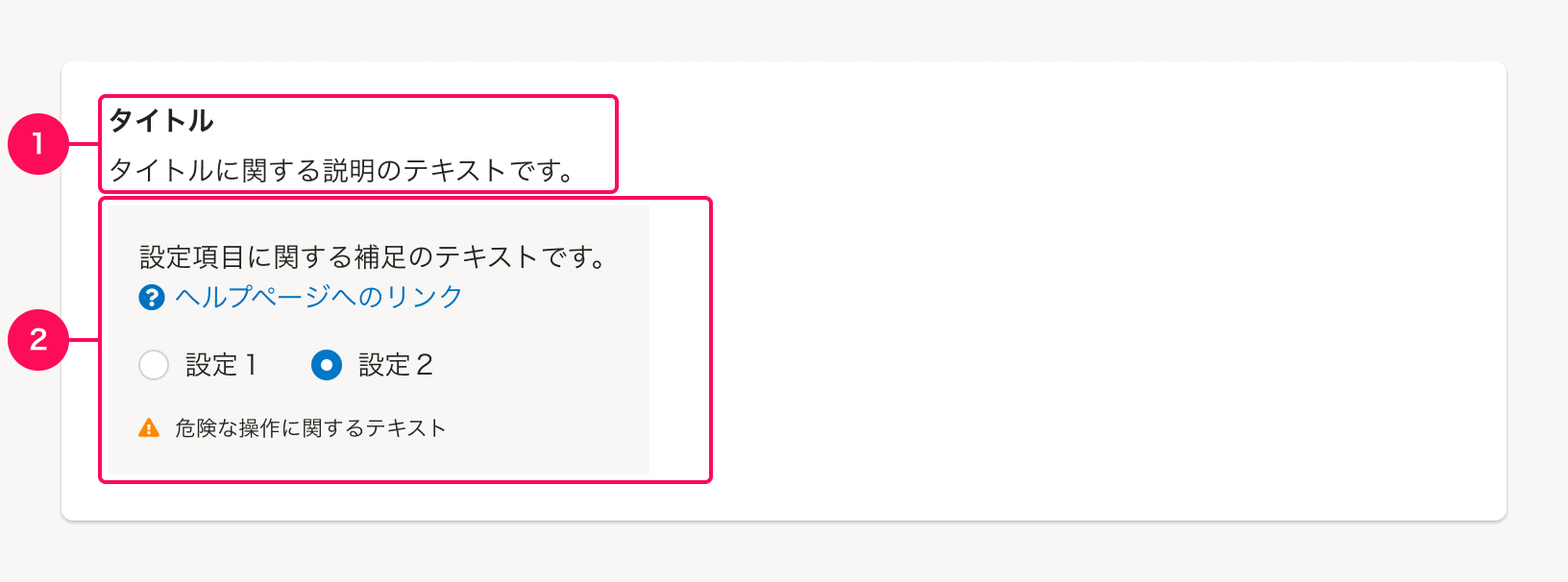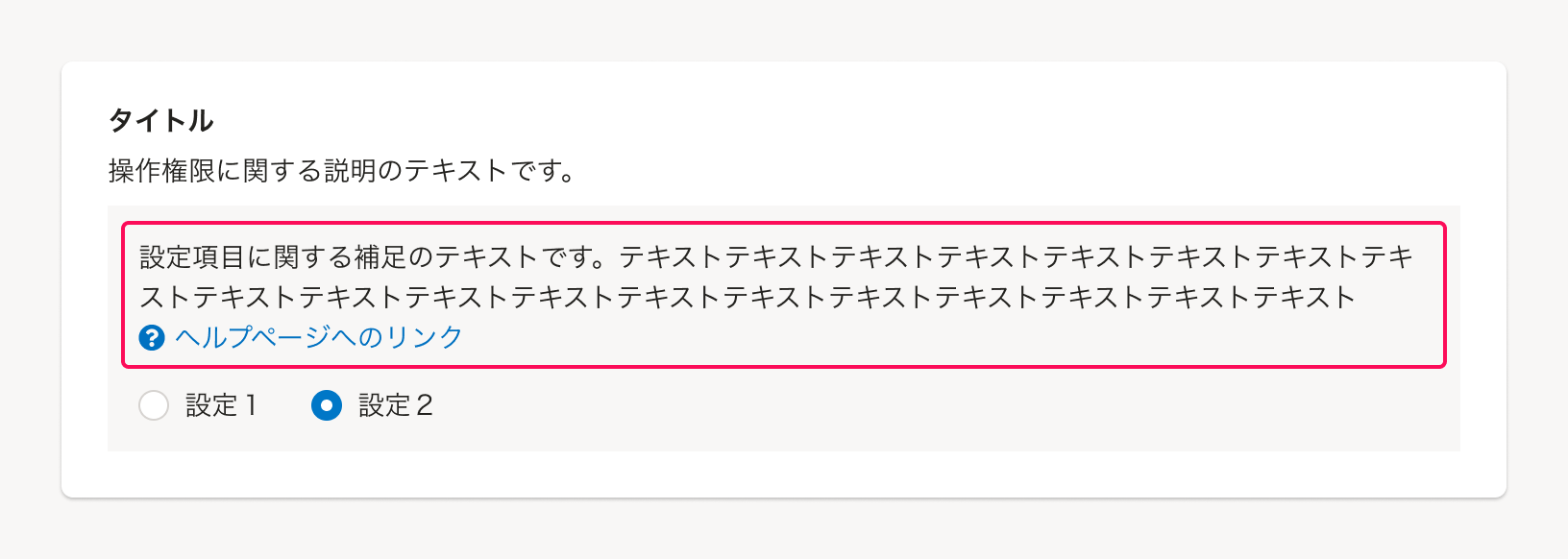 補足テキストは、設定項目について補足する必要がある場合に、余白の取り方に従ってエリア内に挿入します。