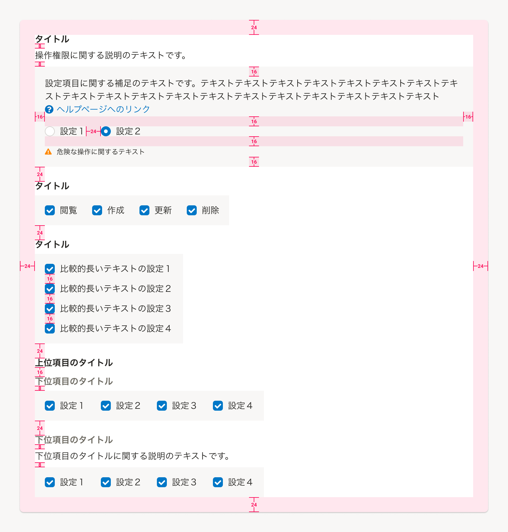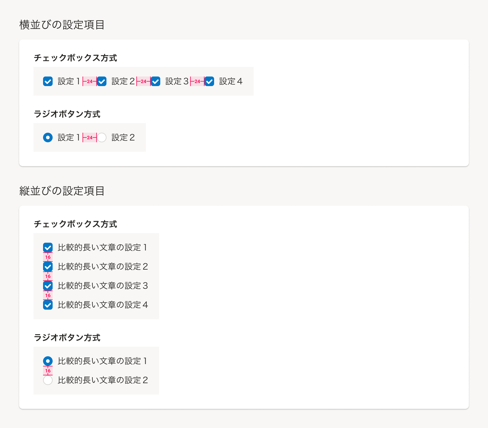 設定項目間の余白は、設定項目同士の関係性を認識でき、誤操作とならない範囲で適切な余白を確保します。