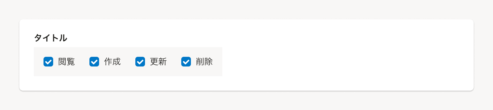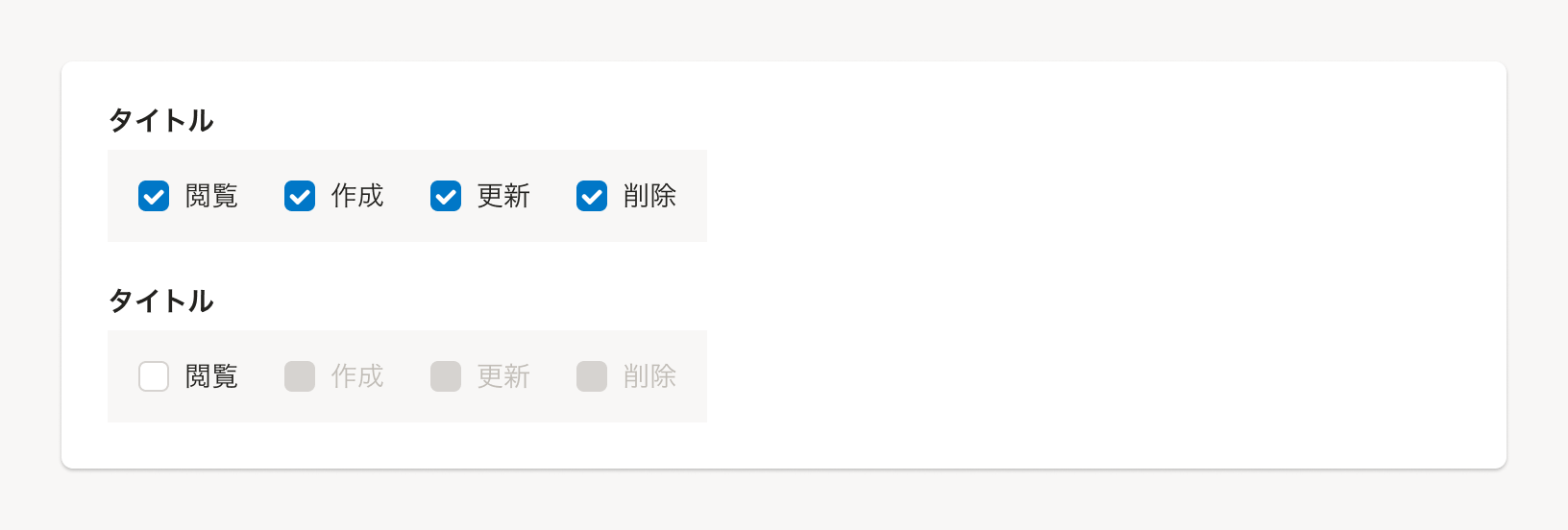 CRUD操作の「作成」「更新」「削除」は、基本的に「閲覧」が許可されていない場合は操作できないため、「閲覧」が不許可の場合はDisabledで選択不可にします。