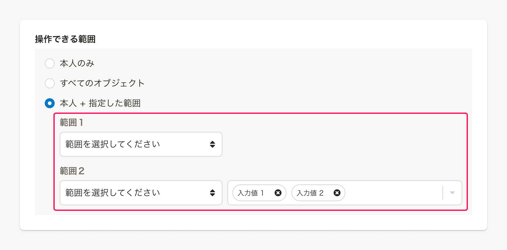設定項目は、操作権限に紐づく設定内容を複数の選択肢から選択できるようにした項目です。