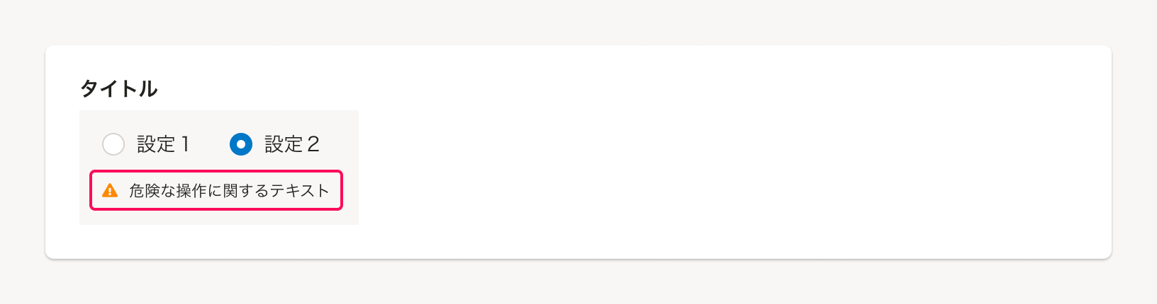 影響する範囲が複雑な場合など特殊な条件が含まれる設定項目には、警告 アイコン(FaExclamationTriangleIcon)と補足テキストを設定項目の下部に表示しユーザーに注意を促すことで、意図しない選択状態になることを防ぎます。