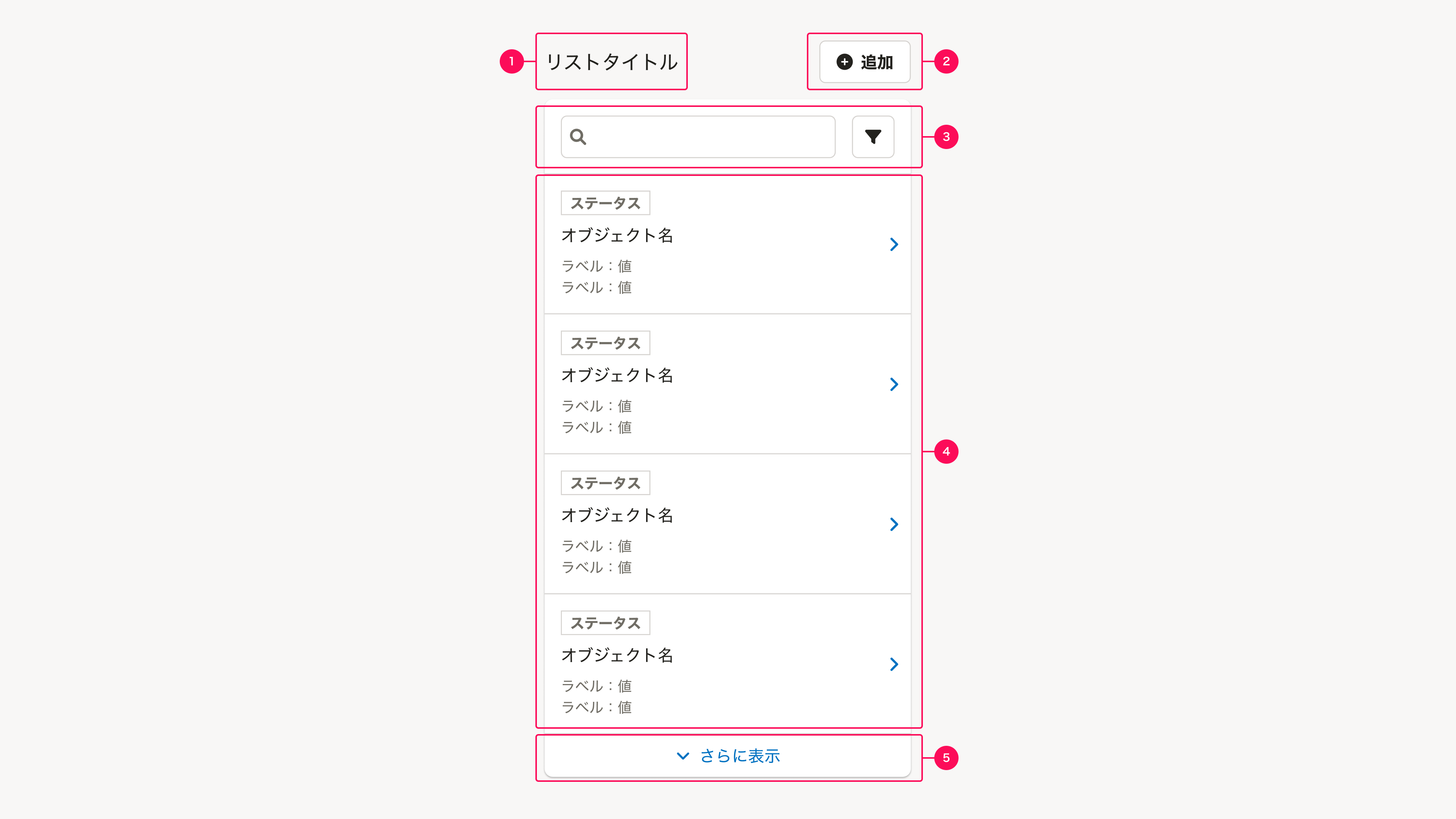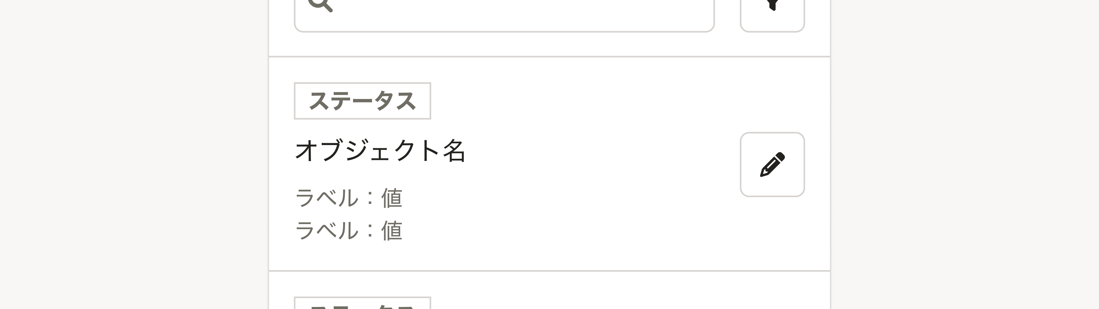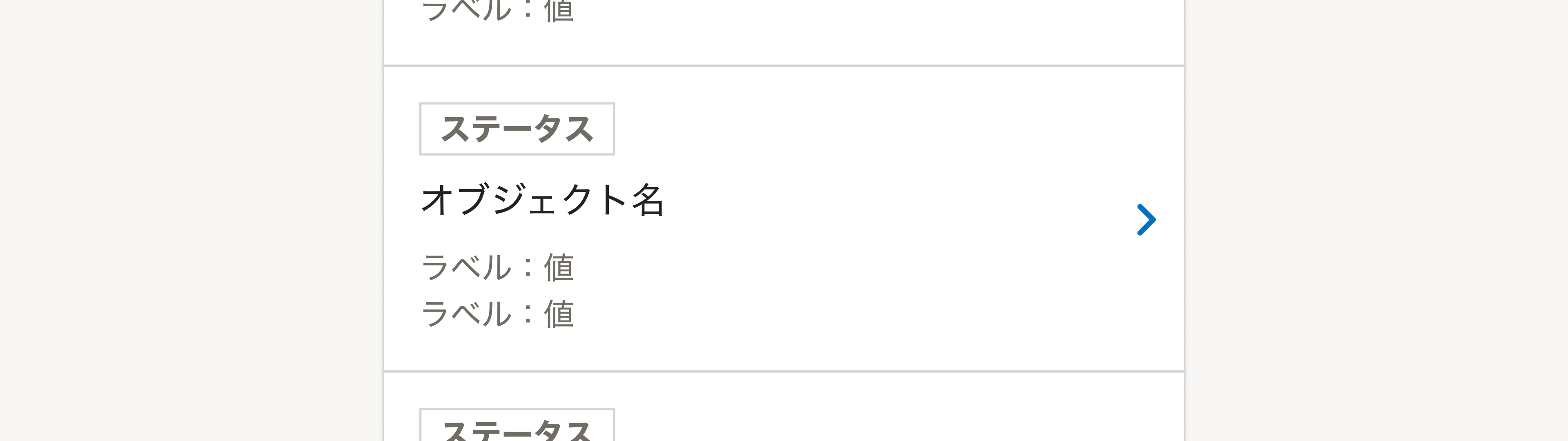 よくあるリストが主に想定しているモバイル環境では表示領域が狭いことから、ステータスに加え、2行分の情報のみ表示できます。(2行に収まる範囲で、3つ以上の情報の表示も可能です。)- オブジェクトの情報にラベルが必要な場合は、