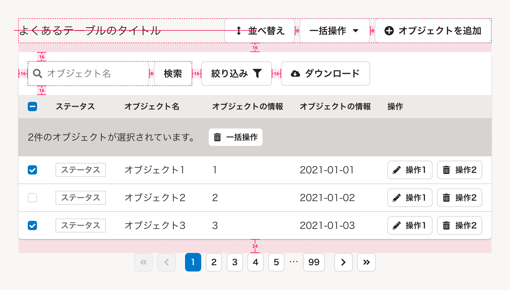 | テーブルのページ送り | - | テーブルのオブジェクトの量(行数)が多くなる場合に、複数のページに分けてPaginationを配置します。 コンテンツの横幅に応じて、表示する内容の量を検討してください。  |