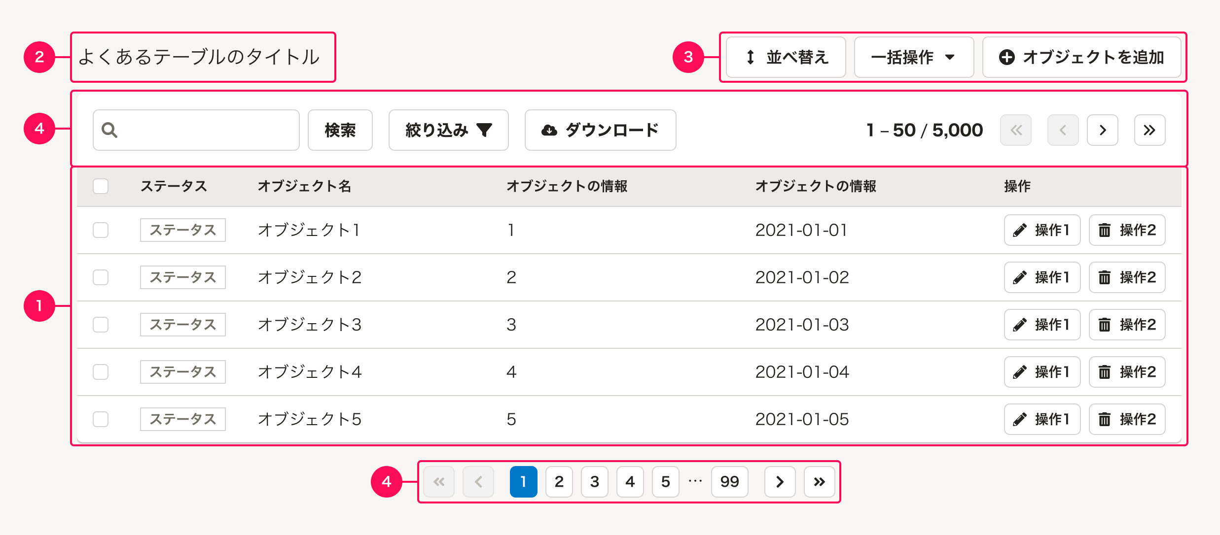 | テーブルのページ数、ページ番号 | 9,999 件中 1-5 件 | 多くの場合、「{総件数} 件中 {表示している順番の範囲} 件」のように、現在表示しているテーブル内容の現在位置を示します。1ページあたり20件〜50件とすることが多いですが、ユースケースや表示速度を考慮して適切な件数を設定します。 コンテンツの横幅に応じて、表示する内容の量を検討してください。  |