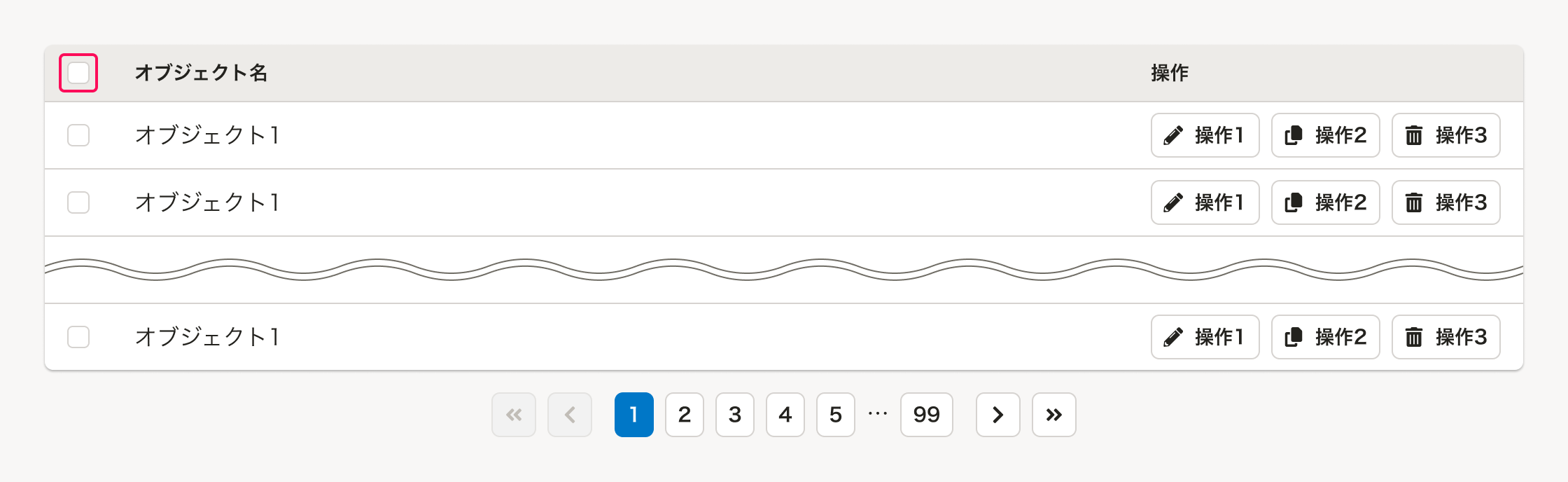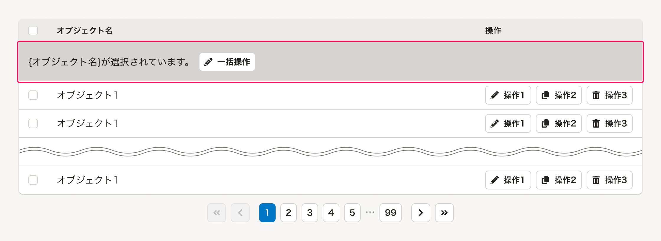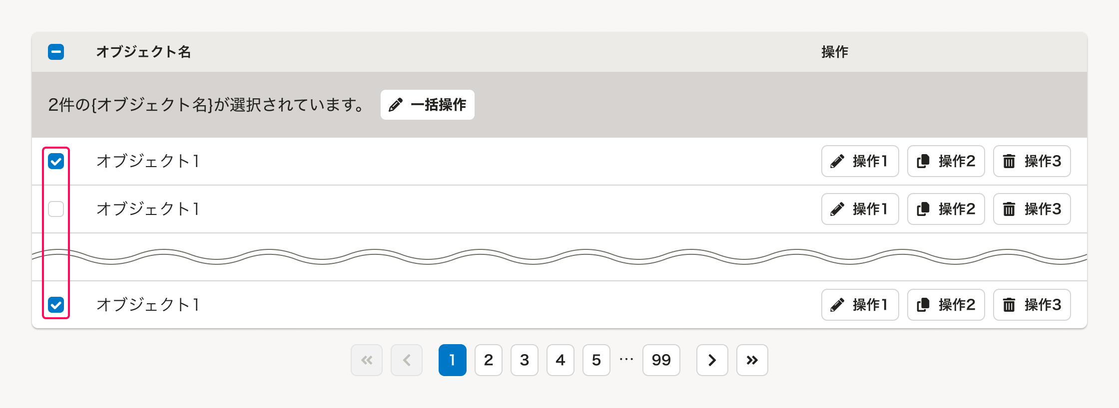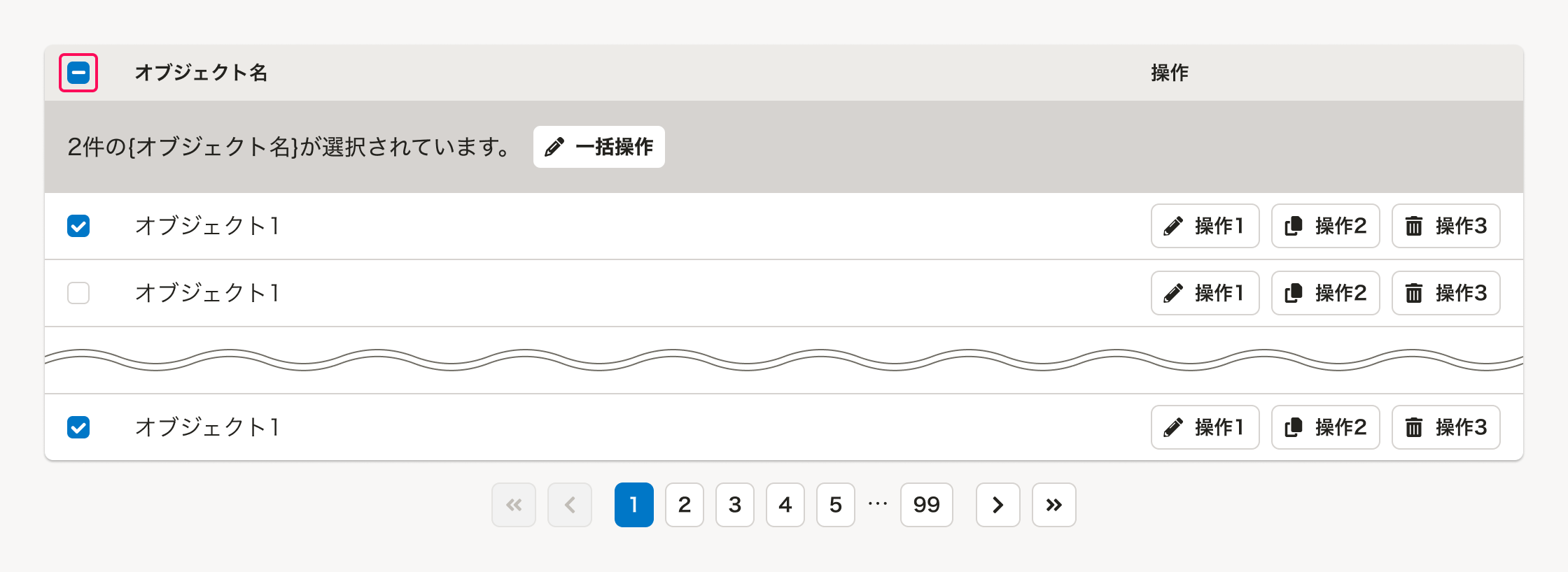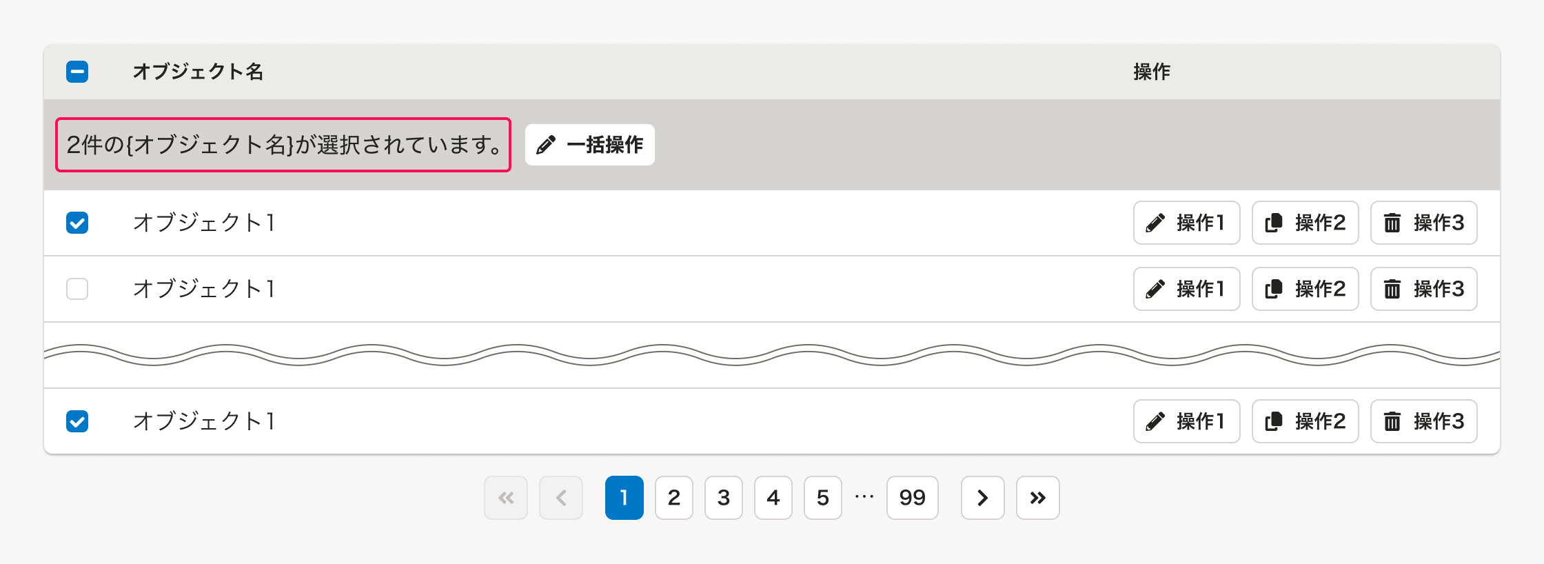 「よくあるテーブル」のなかで、複数オブジェクトへの一括操作に関するUIは、以下の要素で構成されます。