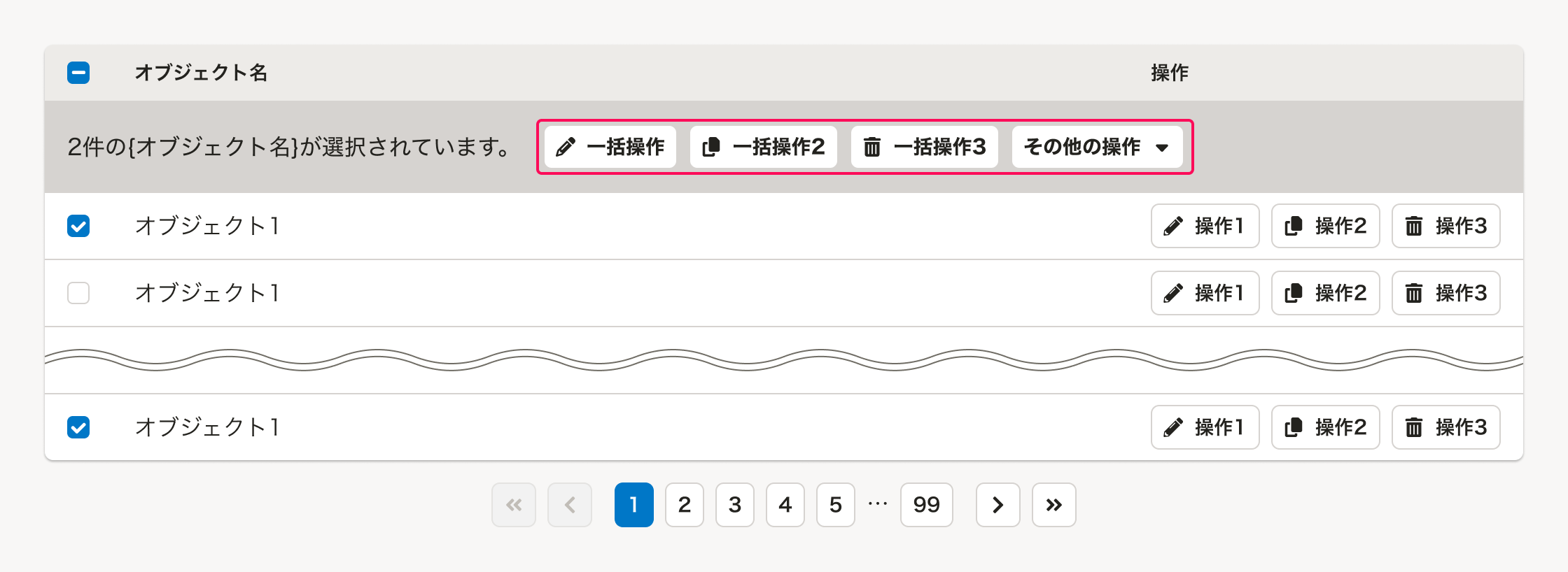 一括操作エリア内の要素として、データの削除・一括変更など、選択したオブジェクトを一括で操作するためのボタンを配置できます。